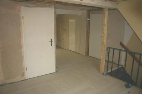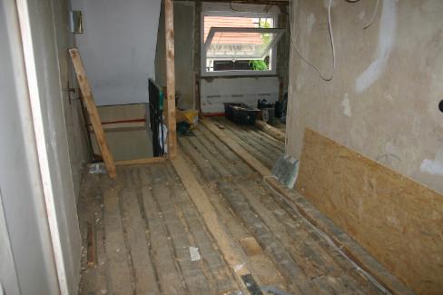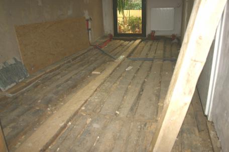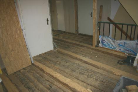Nachdem Rückbau der alten Bodendielung Begradigung der Balken